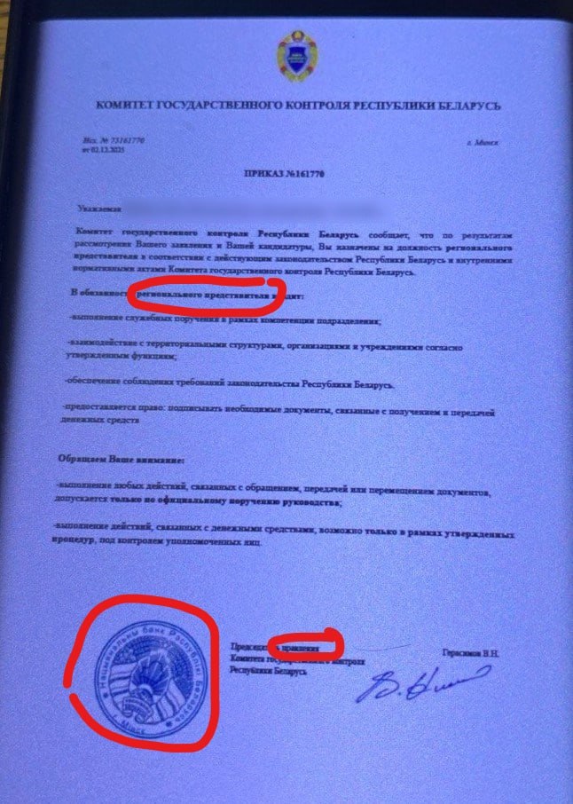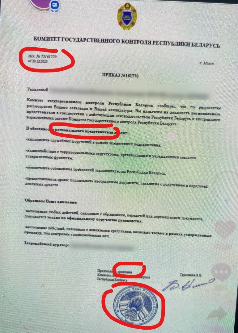 В отдельных случаях людям предлагают стать сотрудниками или общественными помощниками КГК, и в подтверждение этого им присылают поддельные приказы Комитета госконтроля и служебные удостоверения.
