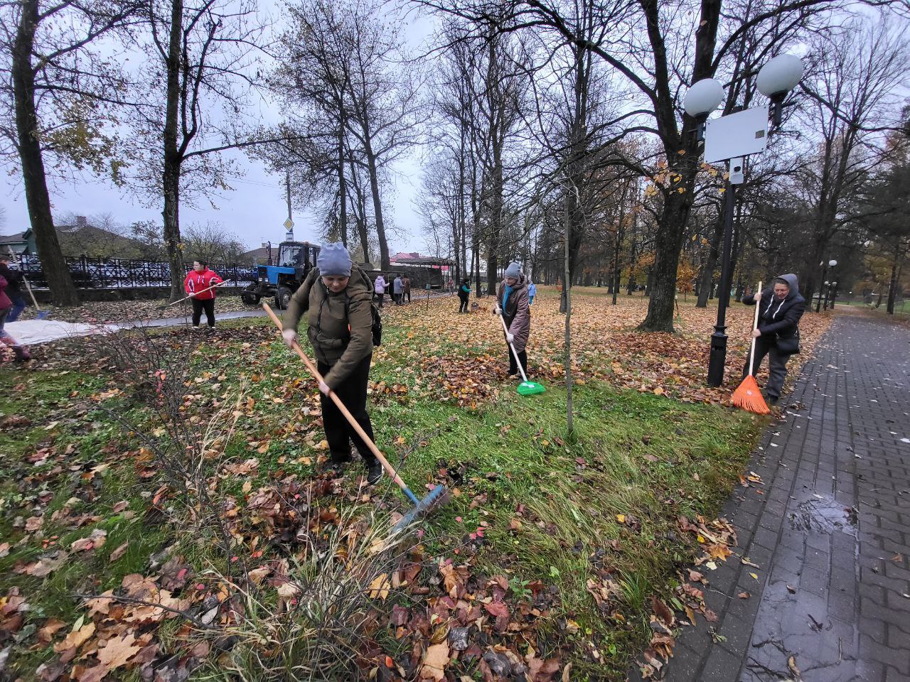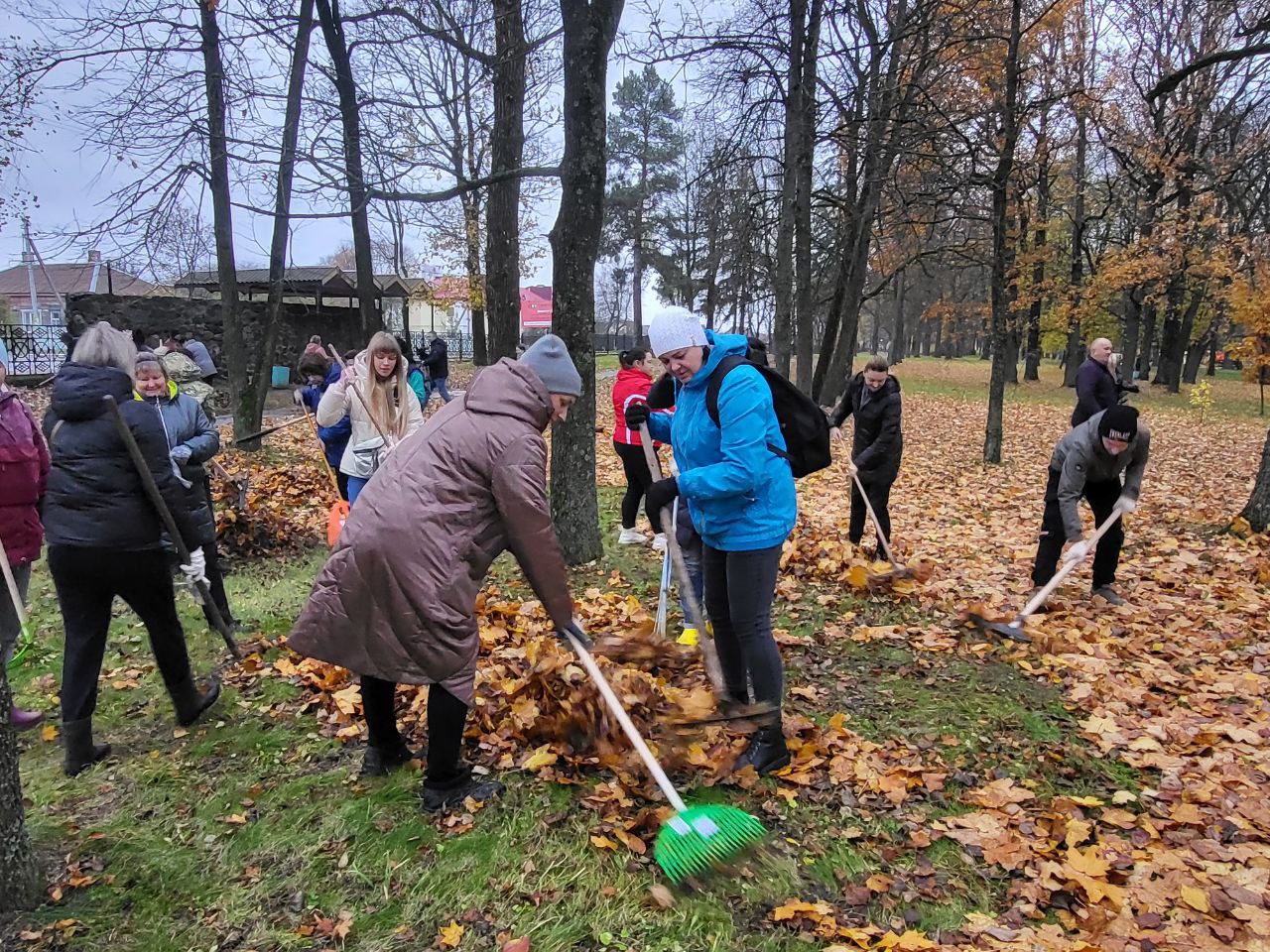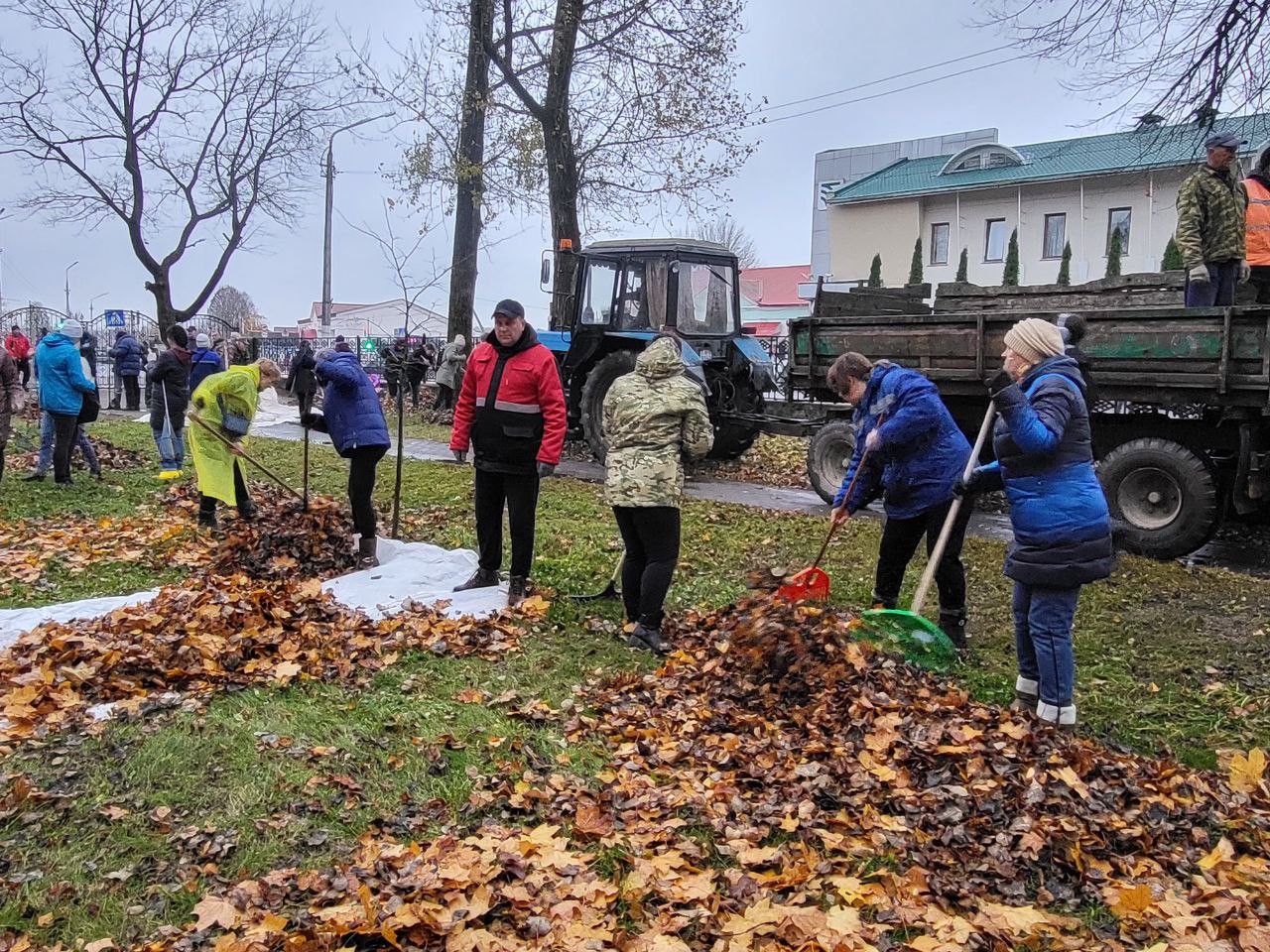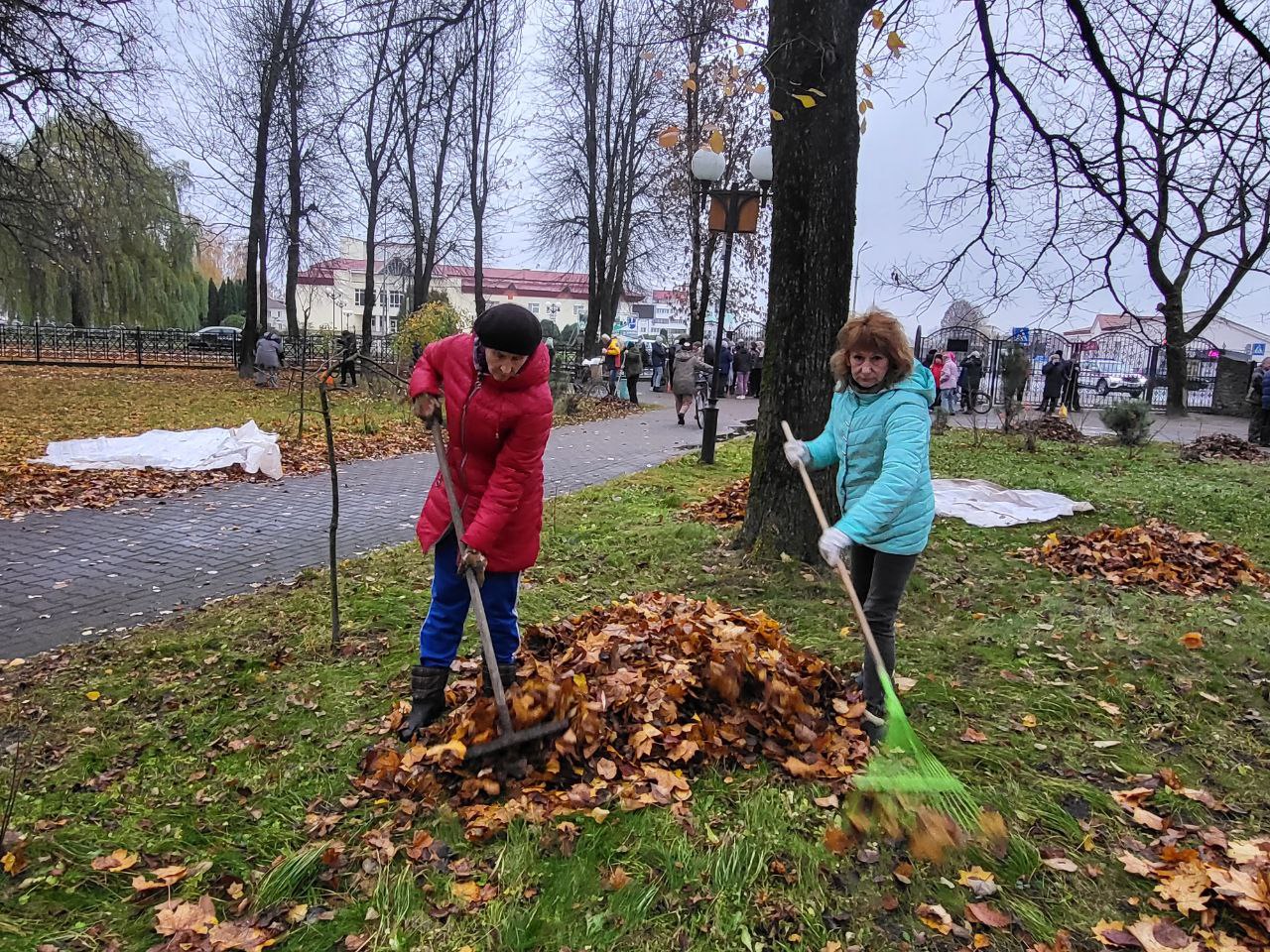 С самого утра представители отделов райисполкома, сотрудники организаций и служб района вышли на уборку территории. Вооружившись граблями и хорошим настроением, они дружно приводят в порядок аллеи, согребают опавшую листву.