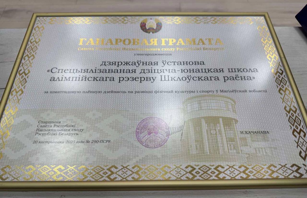 За многолетнюю плодотворную деятельность по развитию физической культуры и спорта в Могилевской области Почетной грамотой Совета Республики Национального собрания Республики Беларусь награждено государственное учреждение «Специализированная детско-юношеская школа олимпийского резерва Шкловского района».