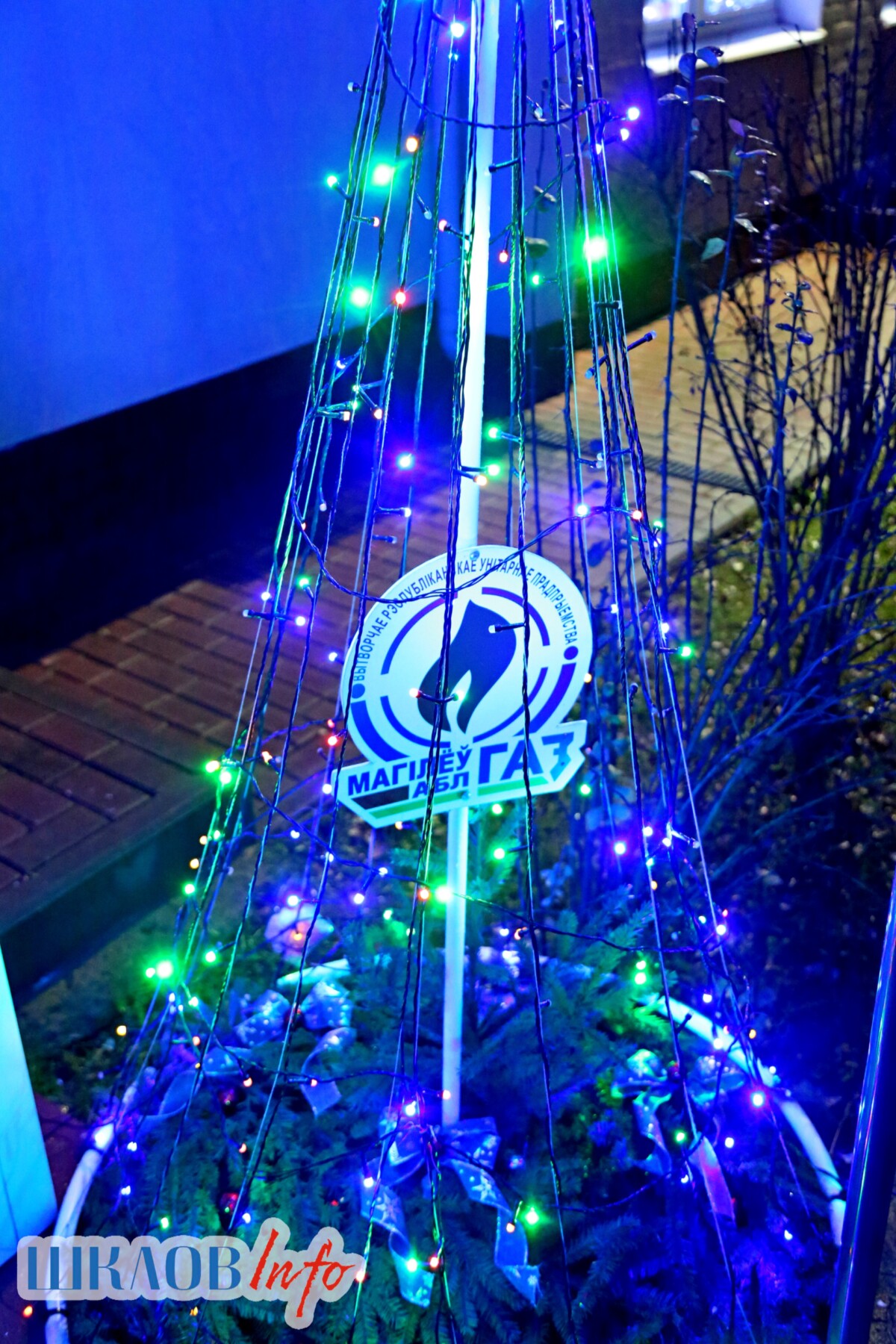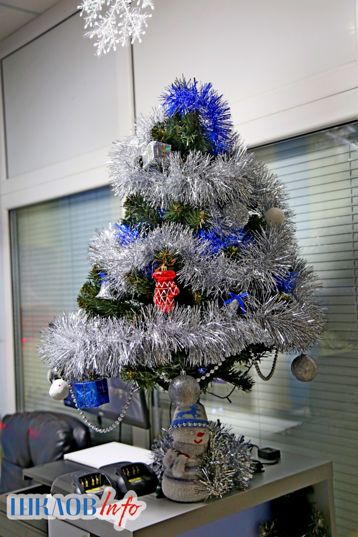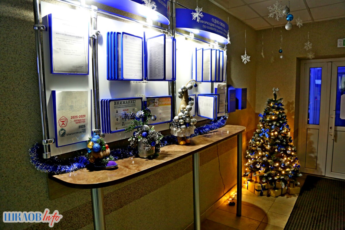 Фасад здания, окна и туи сияют гирляндами, создавая праздничное настроение для всех, кто приходит на работу или проезжает мимо. Начальник Шкловского РГС Вячеслав Мельников отмечает: «Это необходимо. Все-таки Новый год, Рождество – это праздники всенародные. У людей благодаря украшениям поднимается настроение. Приятно нашим работникам, и людям, которые проезжают мимо нашего здания».