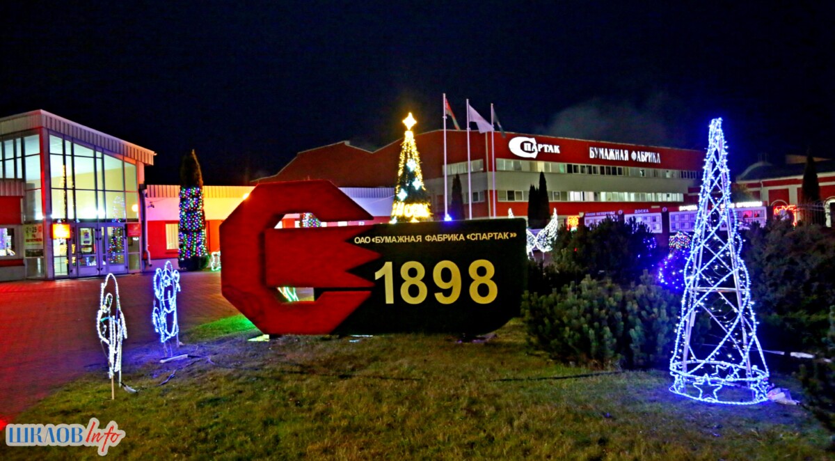 Настоящий подарок для шкловчан подготовили работники ОАО «Бумажная фабрика «Спартак». Здесь создана яркая новогодняя площадка, которая сразу стала популярной фотозоной для жителей города. Фасад здания переливается огоньками, а вокруг елочки расположились сказочные персонажи. Привлекает внимание и световая фигура в виде карты Беларуси.