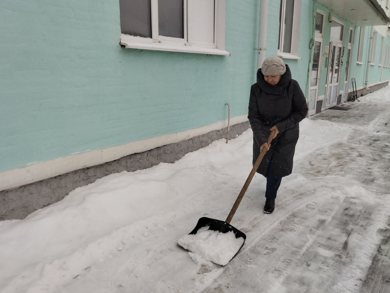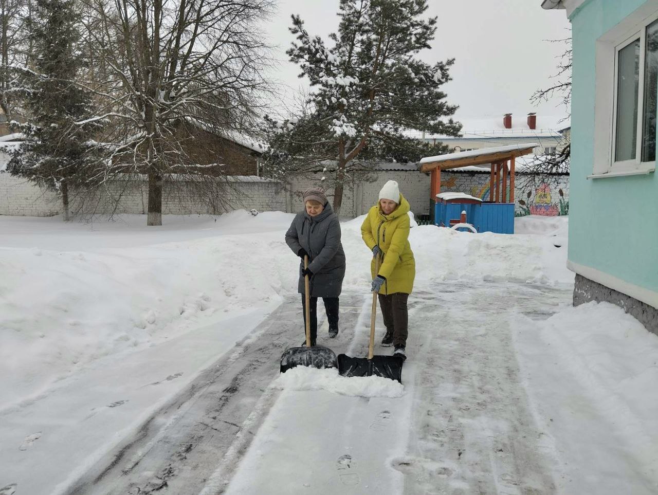 Уже в первые часы рабочего дня работники на уборку территории учреждения. Главная задача – обеспечить безопасность: расчистить дорожки к входу, игровые зоны.