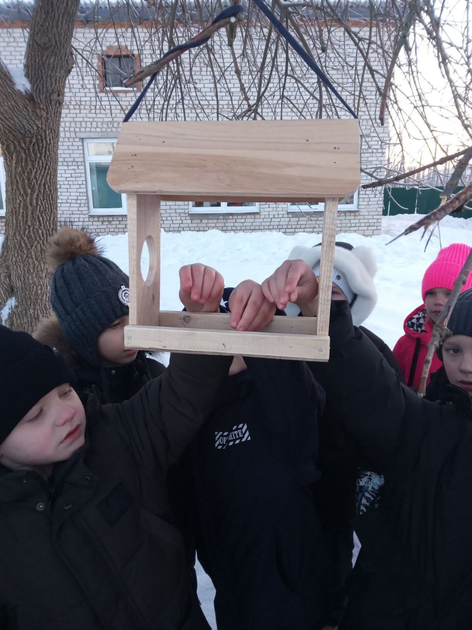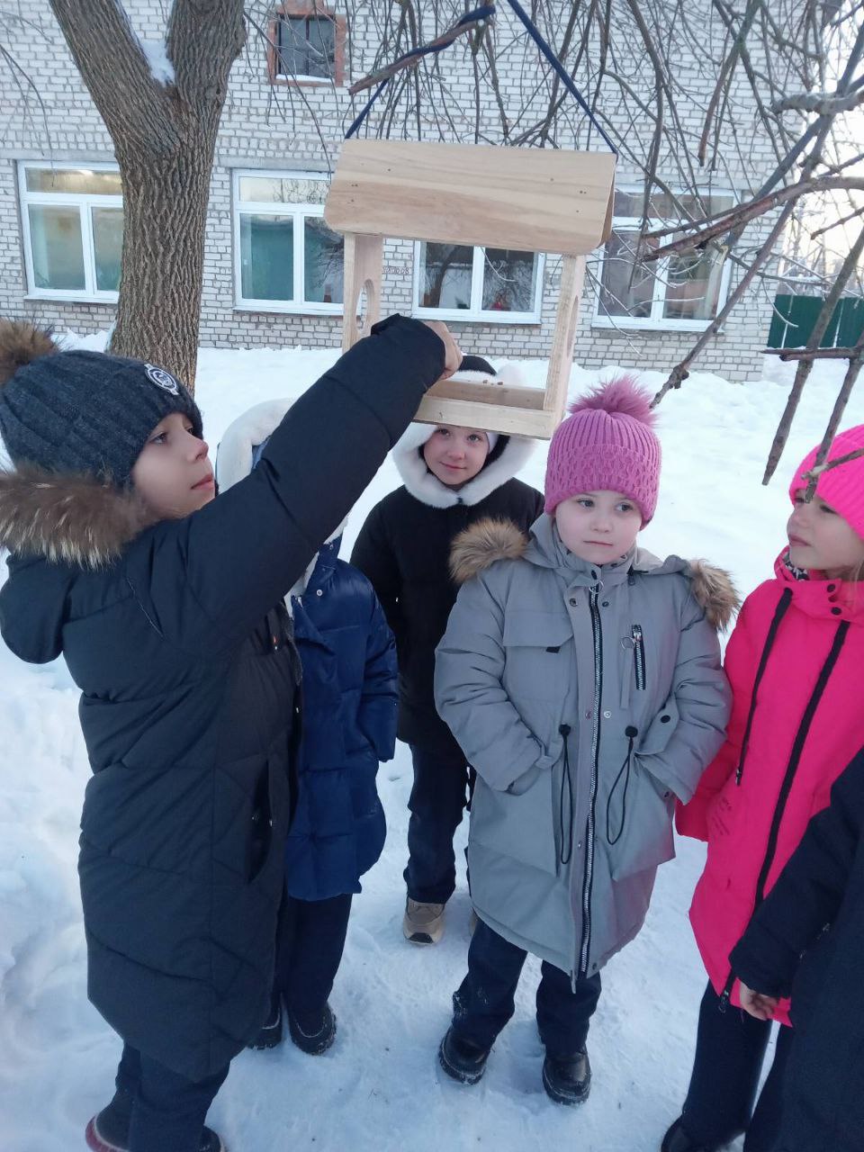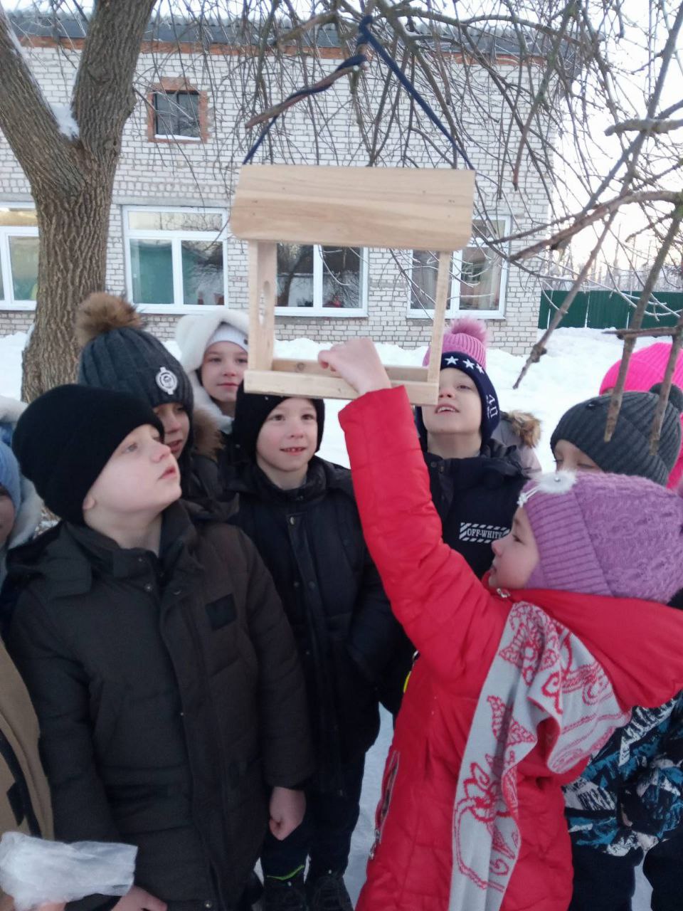 Теперь на школьной территории появились «столовые» для синиц, воробьев и других зимующих птиц. В условиях морозов, когда природные источники пищи исчерпаны, даже горсть семечек или кусочек сала может спасти птицу от голода.
