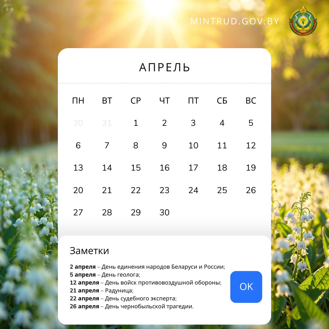 Апрель-2026: как и сколько белорусы будут работать и отдыхать